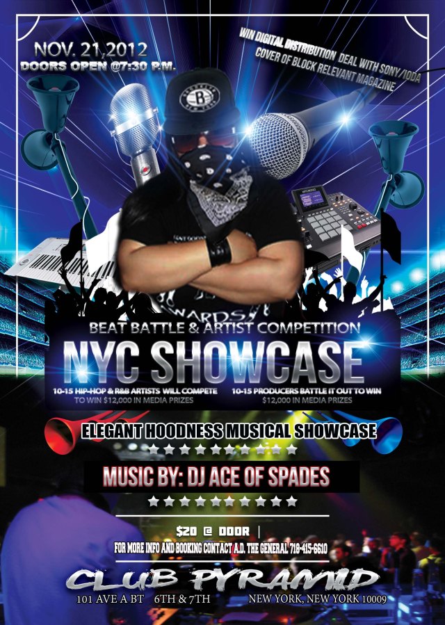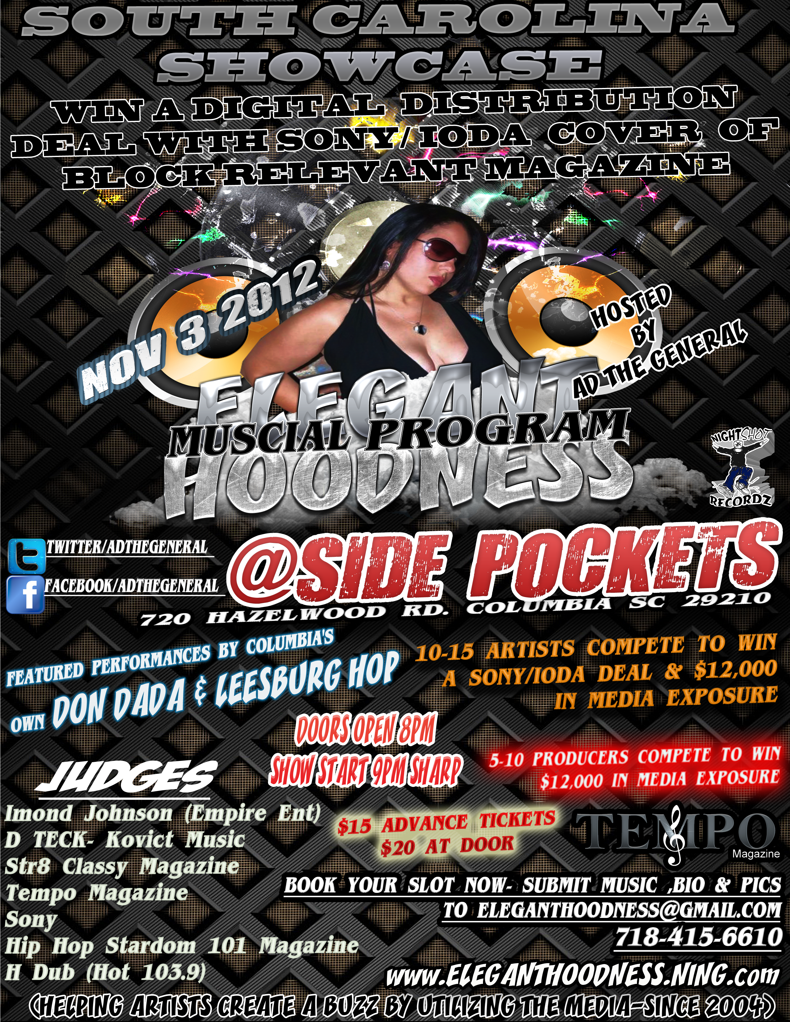 A.D. THE GENERAL N TEAM NAN/NAB CELEBRATE THERE 8TH YEAR OF HOSTING EVENTS MONTH AFTER MONTH HELPING ARTISTS CREATE A BUZZ BY UTILIZING THE MEDIA SINCE 2004. GRACING THE STAGE IS 1ST PLACE WINNER ASSAS IN THE LAST SHOWCASE GETTING SONY/IODA DIGITAL DISTRIBUTION AND MORE. ELEGANTHOODNESS ARE NOW A NATIONAL TRAVELING SHOWCASE- VISIT ELEGANTHOODNESS.NIING.COM TO VIEW CALENDER OF ENTIRE TOUR SCHEDULES.IF YOUR LOOKING TO PERFORM N OR SPONSOR CONTACT A.D. THE GENERAL