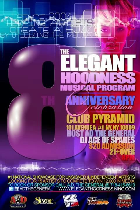 Tags: 8th Yr Anniversary, Ad the General, Anniversary Celebration, Artist/Producer Showcase, Block Relevant Maga, club pyramid, Eleganthoodness Musical Program, Eleganthoodness.ning.com, Globalshyne, Hip Hop Star, Six Twelve Magazine, Sony/Ioda Digital Distribution